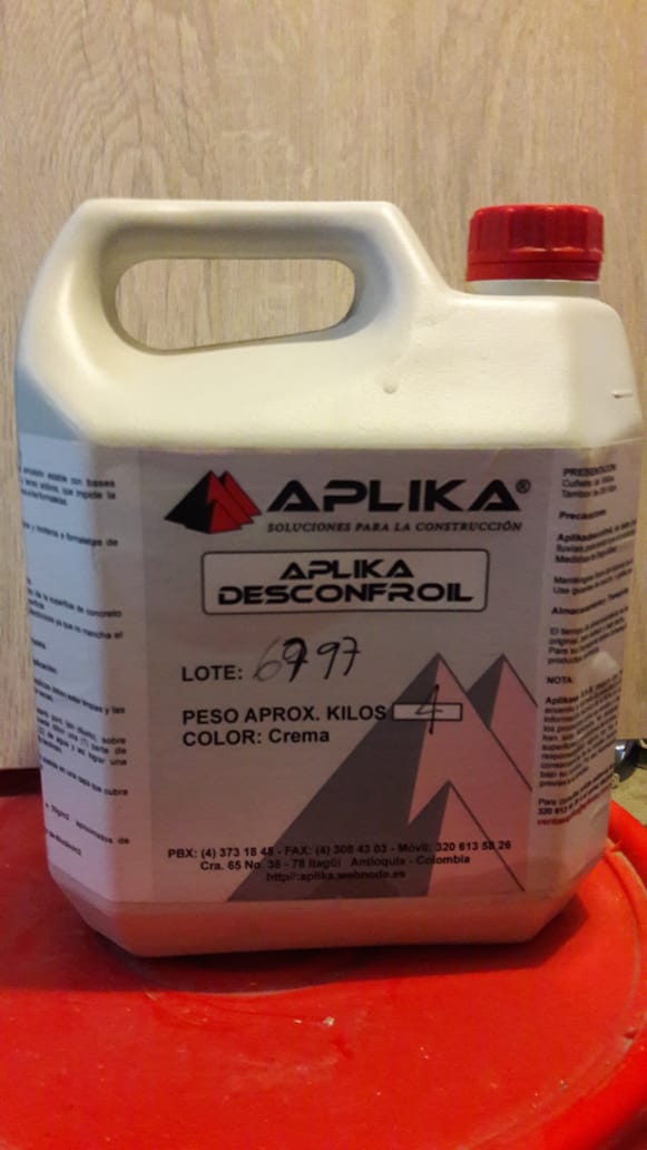 Sobre formaletas metálicas usarlo puro (sin diluirlo), sobre formaletas de madera se puede diluir una (1) parte de Aplika Desconfroil, y una (2) de agua y así lograr una emulsión homogénea de aspecto lechoso.